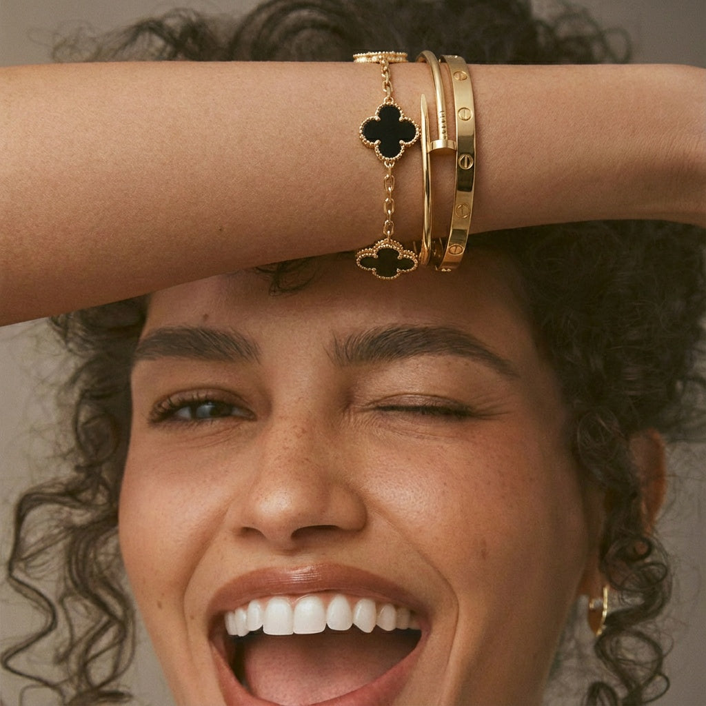 • Trinity & Clover Bracelet: A delicate and adjustable bracelet (16+5 cm) with charming details, available in gold or silver.
