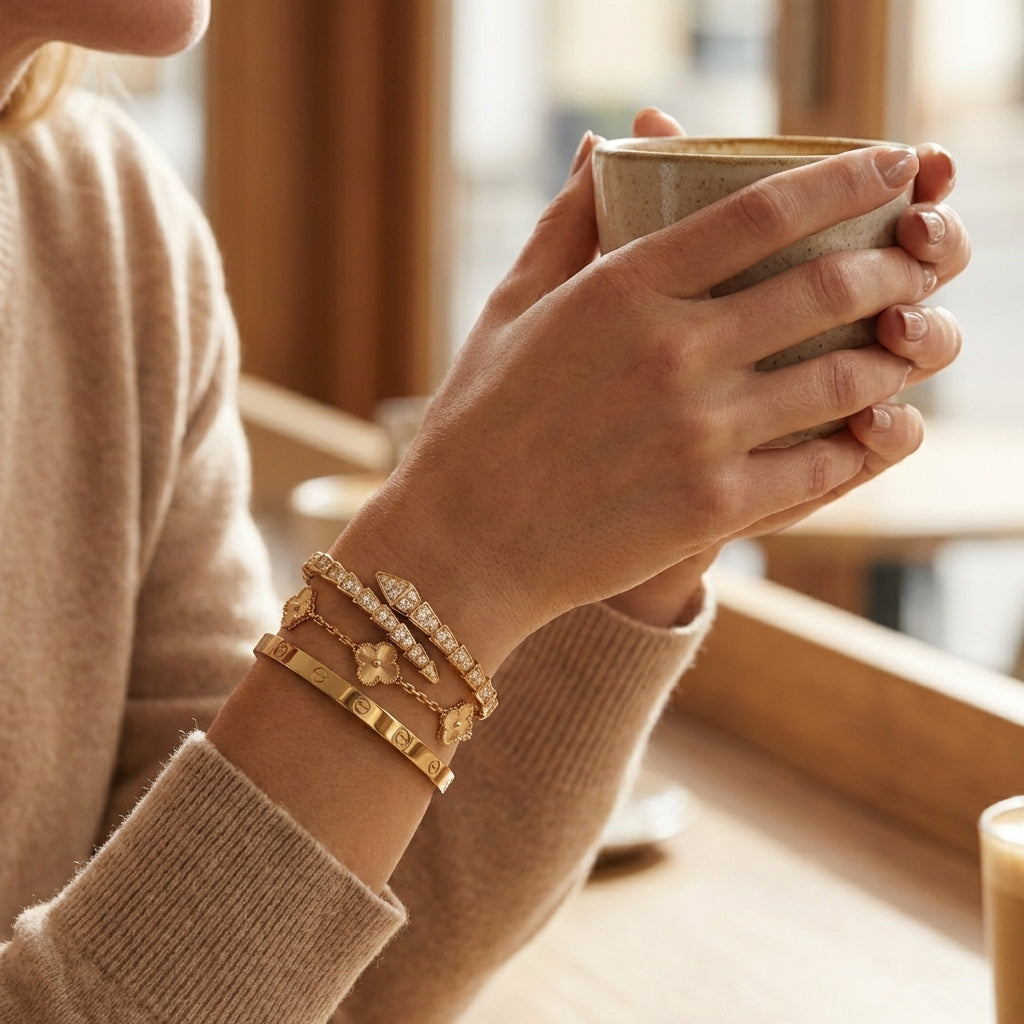 18k gold plating on surgical steel. Engineered to stay brilliant, always.